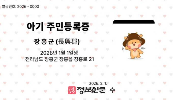 장흥군 관계자는 “아기 주민등록증을 통해 아이의 출생을 기념하며, 가족들에게 따뜻한 추억이 되길 바란다”며 “앞으로도 다양한 출산 장려 정책을 마련해 아이 키우기 좋은 장흥을 만들겠다”고 밝혔다.