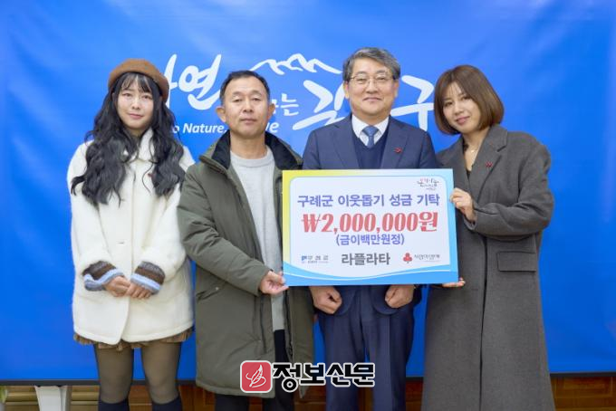 김순호 구례군수는 “해마다 변함없이 이웃사랑을 실천해 주시는 라플라타 김미라 대표님께 깊이 감사드린다”며 “이러한 따뜻한 나눔이 지역사회 전반에 희망을 전하는 큰 힘이 되고 있다”고 말했다.