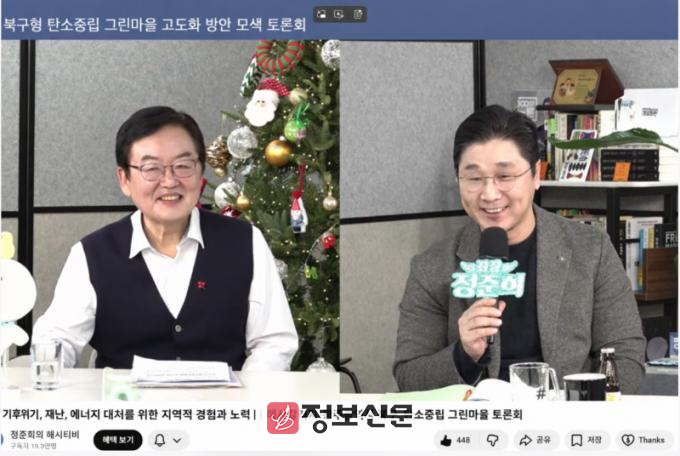 이번 토론회는 전국 최초 생활권역형 탄소중립 그린마을 사업의 3년간 추진 성과를 공유하고, 생활권역 연합공동체를 기반으로 한 기후재난 대응 안전망 구축 방안과 향후 사업 고도화 방향을 논의하기 위해 마련됐으며, 12월 24일부터 정준희의 해시티비 유튜브 채널을 통해 누구나 시청 할 수 있다.