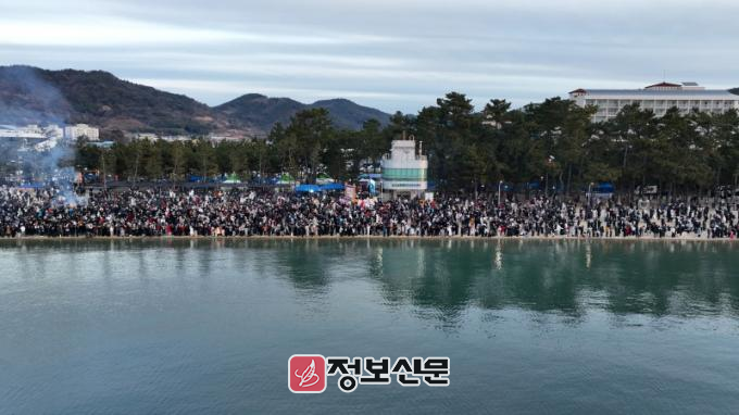 2026년 새해 첫날인 1월 1일 전남 보성군 율포 솔밭해변 일원이 해맞이객들로 인산인해를 이루고 있다. 보성군에 따르면 이날 해맞이 행사에는 영하의 쌀쌀한 날씨에도 불구하고 군민과 관광객 등 2만여명이 운집했다. 어둠을 뚫고 수평선 위로 힘차게 솟아오르는 붉은 태양을 바라보며 저마다의 소원을 비는 수만의 인파가 어우러져 장관을 연출했다.