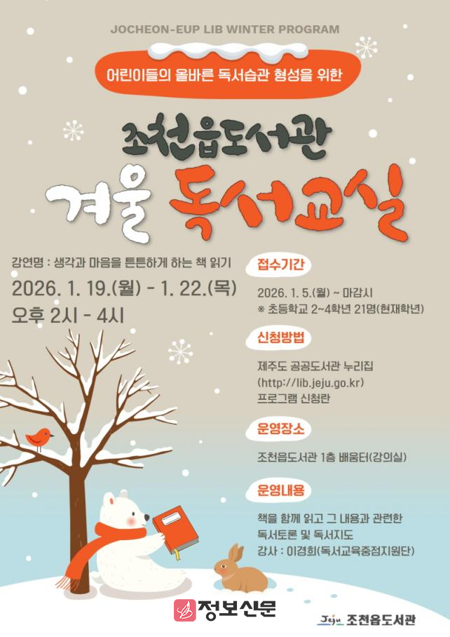 ![]() 조천읍도서관, 겨울 독서교실 참여자 모집 |