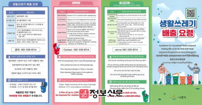 ![]() 나주시가 외국인을 대상으로 제작한 생활폐기물 적정 배출 다국어 홍보물.(사진 제공-나주시)