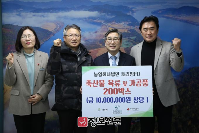 나주시(시장 윤병태)는 지난달 30일 농업회사법인 토리팜FD(대표 최원준)가 관내 취약계층 지원을 위해 삼겹살, 목살, 앞다릿살 등 축산물 가공품 200박스(1천만 원 상당)를 기탁했다고 2일 밝혔다.