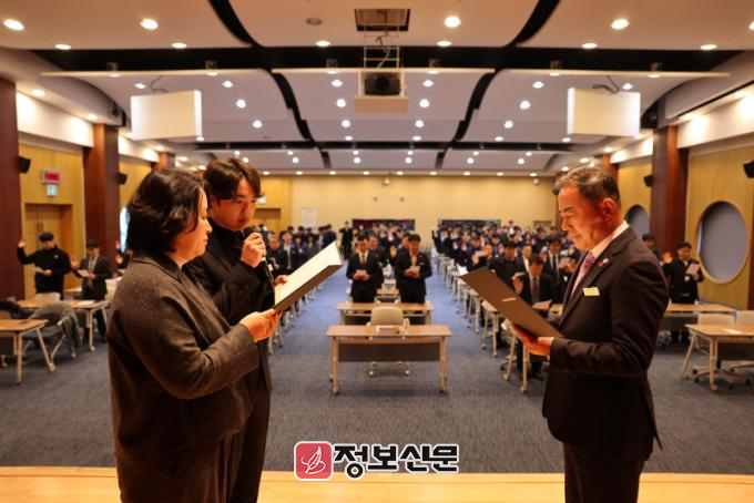 ![]() 2일 진행된「2026년 반부패·청렴 서약식」에서 여수광양항만공사 황학범 직무대행과 직원 대표들이 청렴 서약서를 낭독하고 있다.