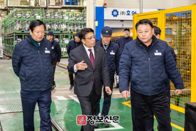 ㈜호원은 기아 쏘울·셀토스 차량에 적용되는 차체 부품을 비롯해광주글로벌모터스(GGM) 캐스퍼 EV 관련 부품을 생산하는 지역 대표 중견기업으로, 광주 지역 산업 생태계에서 중요한 역할을 수행하고 있다. 이어진 면담에서는 제조 현장의 운영 상황과 글로벌 시장 환경 속 기업 경영 전반에 대해 다양한 의견을 나눴으며, 지역경제 활성화 방안에 대해서도 논의를 이어갔다.