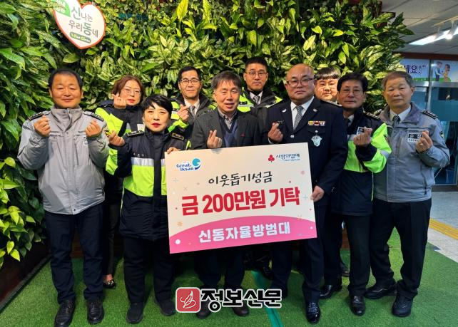 신동자율방범대(대장 오승록)는 6일 신동 행정복지센터를 찾아 성금 200만 원을 기탁하며 이웃사랑 실천에 앞장섰다.