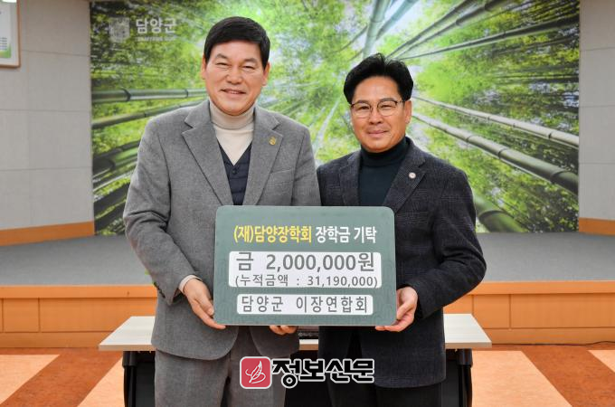 담양군 12개 읍·면 이장들로 구성된 담양군 이장연합회는 지역사회와 상생하는 나눔을 실천하고자 지난 2009년부터 현재까지 3,100만 원의 장학금을 꾸준히 기탁해 오고 있으며, 올해도 새해의 시작과 함께 담양군의 발전과 미래 인재 양성을 기원하는 마음을 한데 모아 장학금을 마련했다.