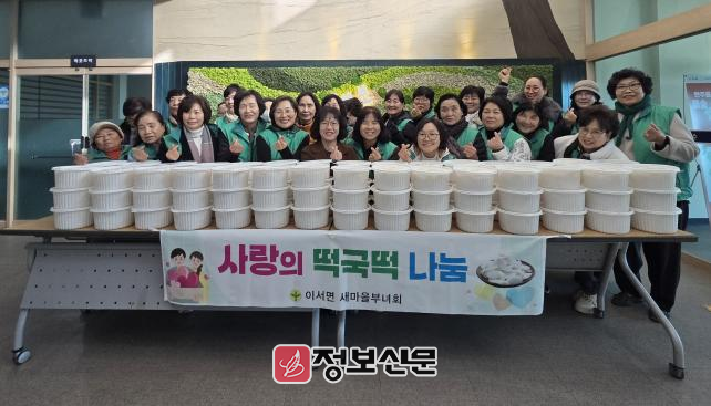 한편, 이서면 새마을부녀회는 떡국떡 나눔 뿐만 아니라 홀몸노인, 조손가정 등 소외계층을 위한 겨울철 김장김치, 밑반찬 나눔 등 지역 봉사활동에 앞장서고 있다.