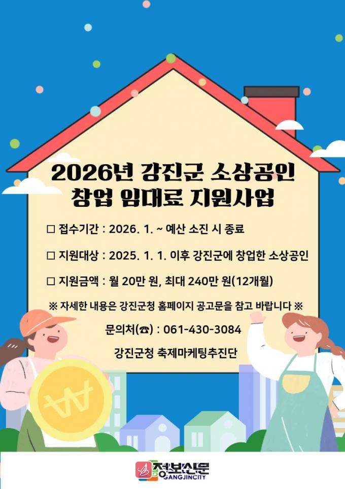 ![]() 강진군에서 창업하면 최대 240만 원 임대료 지원! |