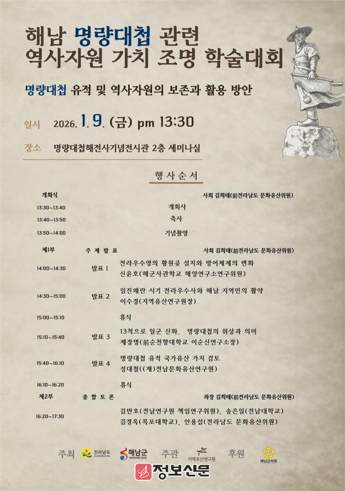 주제 발표 후에는 김희태 전라남도 문화유산위원을 좌장으로 김만호 전남연구원 책임연구위원, 송은일 전남대학교 이순신해양문화연구소실장, 김경옥 목포대학교 교수, 안용섭 전라남도 문화유산위원 등 전문가들이 참여하는 종합 토론이 이어져 명량대첩의 역사적 의미를 되새기고 지역 발전의 초석을 다질 예정이다.