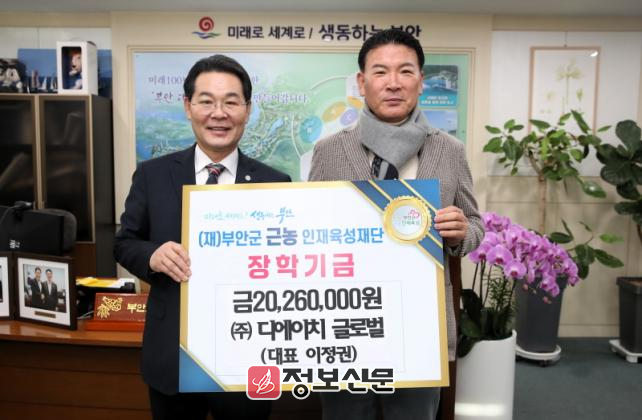 특히 디에이치글로벌이 2016년부터 현재까지 부안군 근농인재육성재단에 기탁한 장학금 누적 금액은 총 1억 4094만원에 달한다.