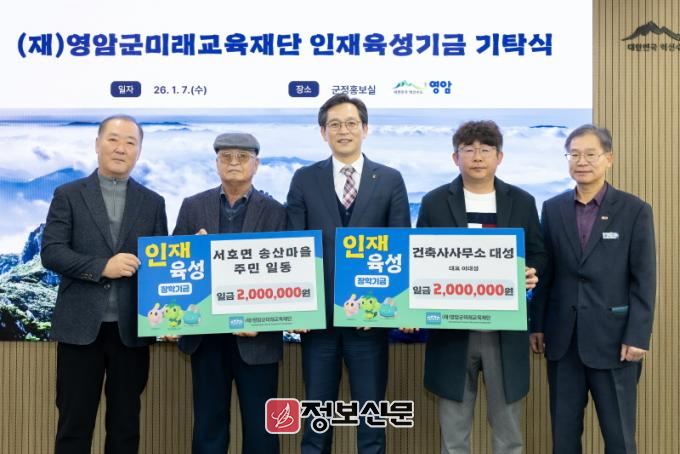 이날 기부로 송산마을 주민들은 2022년과 2023년, 지난해에 이어 총900만원의 장학금을 미래세대를 위해 내놓았다. 같은 날 이대성 건축사사무소 대성 대표도 장학금 200만원을 영암군미래교육재단에 기부했다.