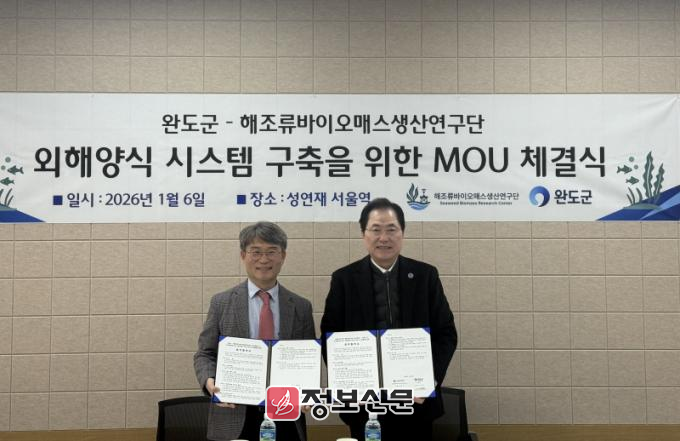 이에 완도군(군수 신우철)은 지난 6일 서울스퀘어에서 사업 용역을 맡은 해조류 바이오매스 생산연구단(단장 윤환수 성균관대학교 교수)과 해조류 외해 양식 테스트 베드(Test Bed) 구축 및 운영, 기술 협력·교류에 관한 업무 협약을 체결했다.