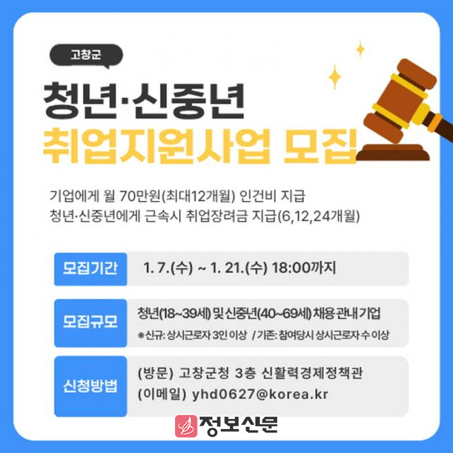 ![]() 고창군, 2026년 청년.신중년 취업지원사업 참여 기업 모집 |