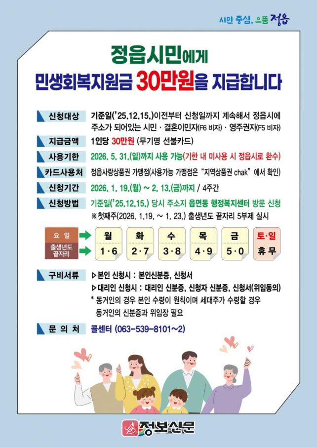 ![]() 정읍시, 1월 19일부터 시민 1인당 민생회복지원금 30만원 지급 |
