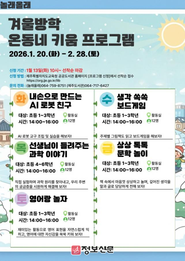 ![]() 제주도서관, ‘2026년 놀래올래 겨울방학 온동네 키움 프로그램’참가자 모집 |