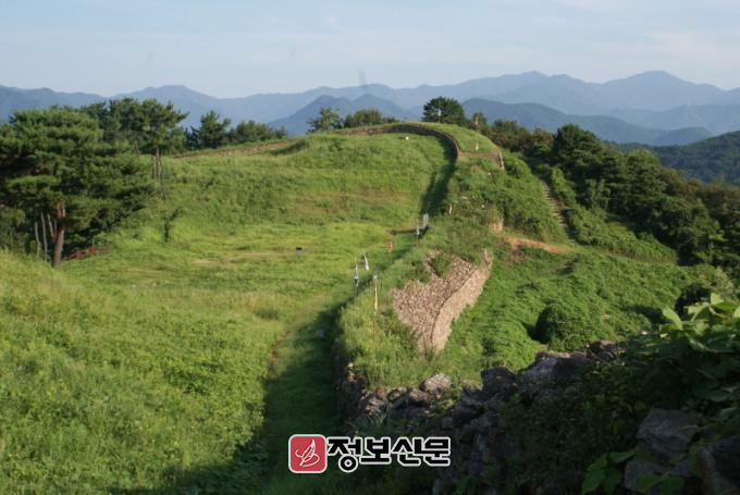 이름에 ‘馬(말)’자가 포함된 마로산성은 정상부를 중심으로 성벽을 둘러싼 테뫼식 산성으로, 가장자리는 높고 중앙은 낮아 말안장을 닮은 ‘마안봉(馬鞍峰)’ 지형을 이룬다.