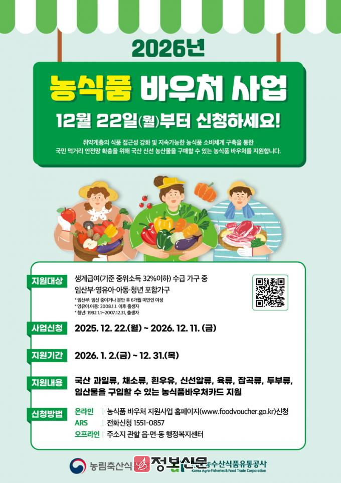농식품 바우처는 지정된 매장에서 신선한 농식품을 구입할 수 있는 카드형 이용권으로, 지원 대상은 생계급여 수급 가구 중 임산부, 아동‧청년(1992년 1월 1일 이후 출생자)이 포함된 가구이다.