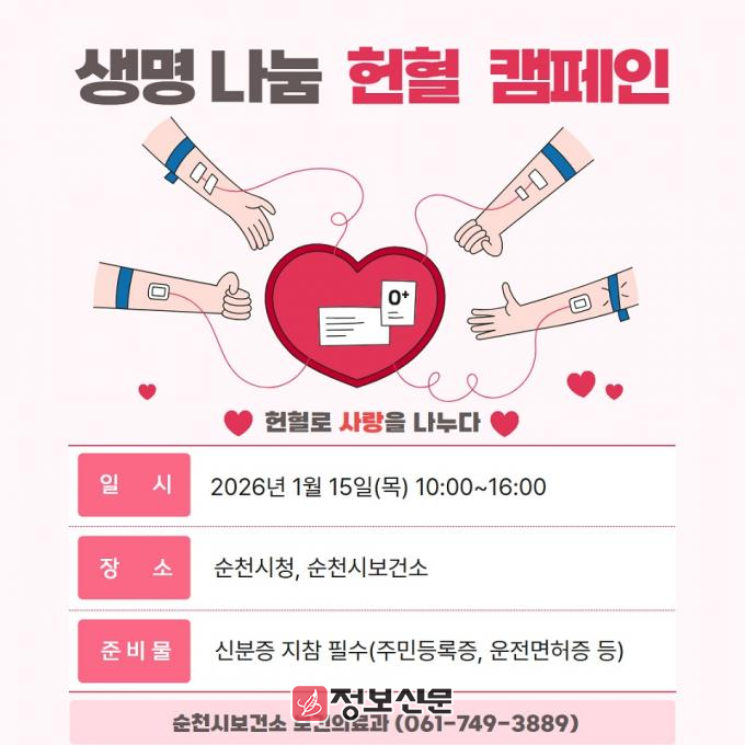 헌혈 관련 문의는 순천시보건소 보건의료과(061-749-3889)로 하면 된다.