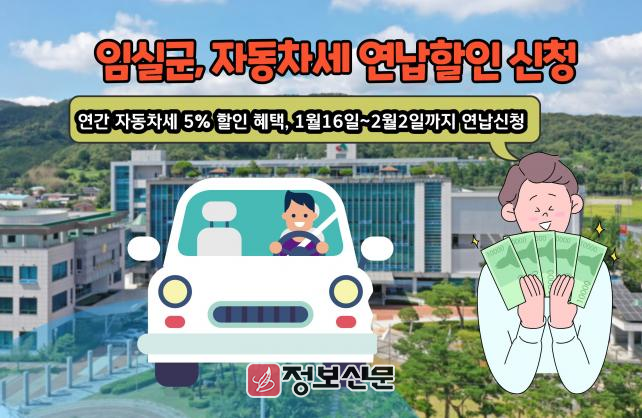 ![]() 임실군, 자동차세 연납하면 이득, 세금부담 ‘뚝’ |