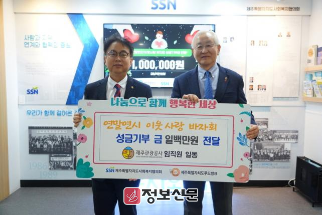 이에 제주사회복지협의회 고승화 회장은 “지역사회를 위한 따뜻한 나눔에 동참해 주신 제주관광공사 임직원 여러분께 깊이 감사드린다”며 “전달해주신 소중한 성금은 도움이 필요한 이웃들에게 희망이 될 수 있도록 의미 있게 사용하겠다”고 전했다.