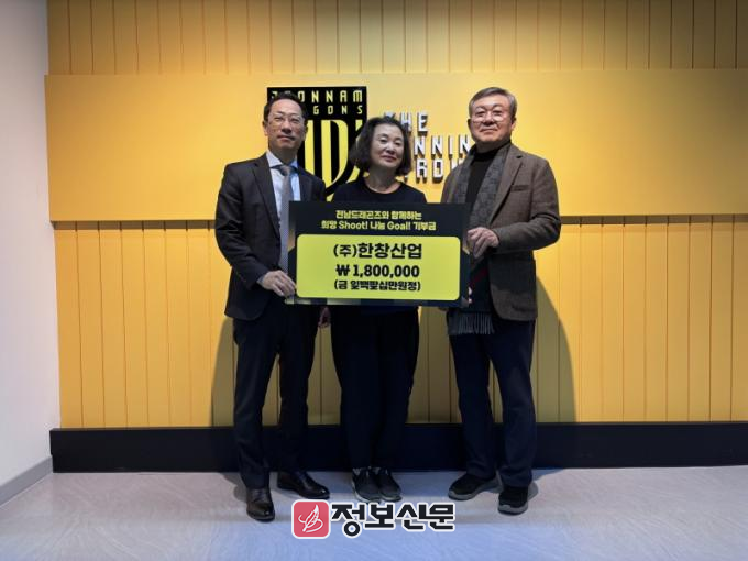 전남드래곤즈는 1월 14일 구단 사무실에서 ㈜한창산업과 함께 희망찬특수어린이집에 기부금 전달식을 진행했다. 이번 전달식은 전남드래곤즈의 사회공헌 활동인 ‘희망슛! 나눔골! 기부챌린지’의 일환으로 마련됐다.