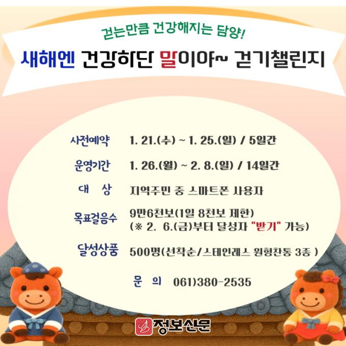 ![]() 담양군, 새해맞이 모바일 걷기 커뮤니티 ‘워크온(Walk ON)’ 운영 |