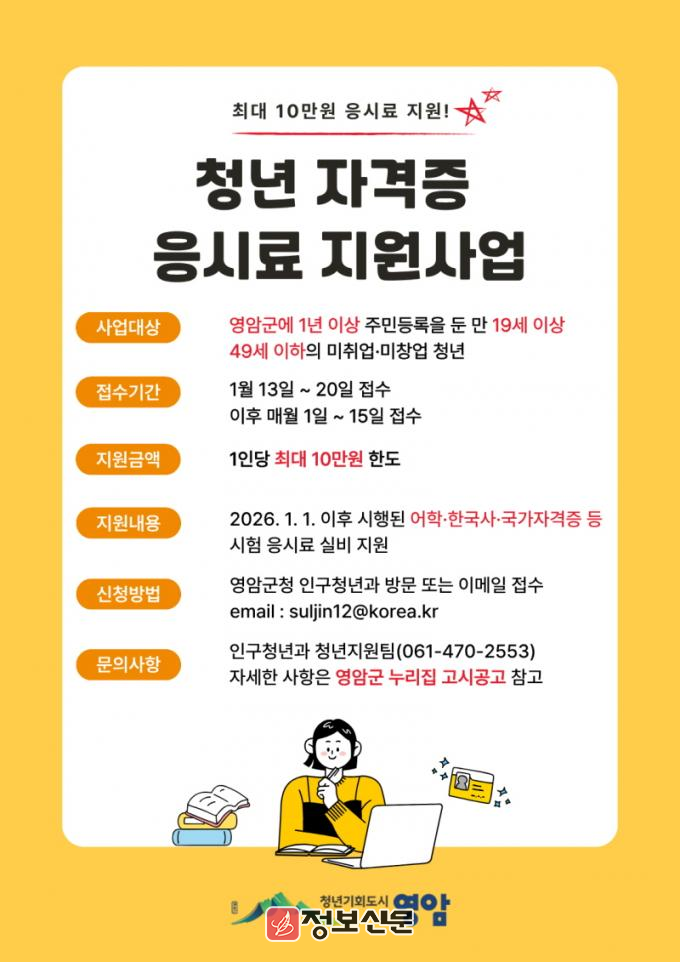 청년 자격증 응시료 지원사업의 자세한 내용은 영암군 홈페이지 ‘고시·공고’란에서 볼 수 있고, 안내는 영암군 인구청년과 청년지원팀(061-470-2553)에서 한다.