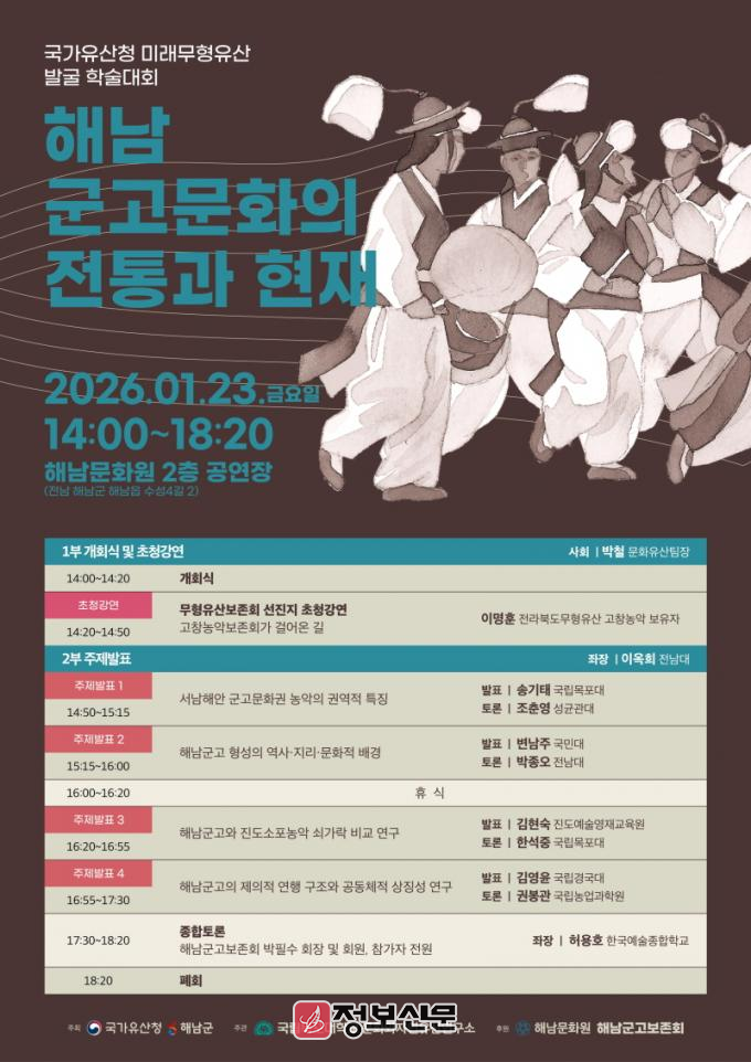 주제 발표 후에는 허용호 한국예술종합학교 교수를 좌장으로 해남군고보존회 박필수 회장과 군고보존회원, 참가자 전원이 함께하는 종합토론이 진행된다. 토론에서는 해남 군고문화의 가치와 의미를 공유하고, 미래 무형유산으로서의 보존과 계승 방안에 대하 자유롭게 의견을 나눌 예정이다.