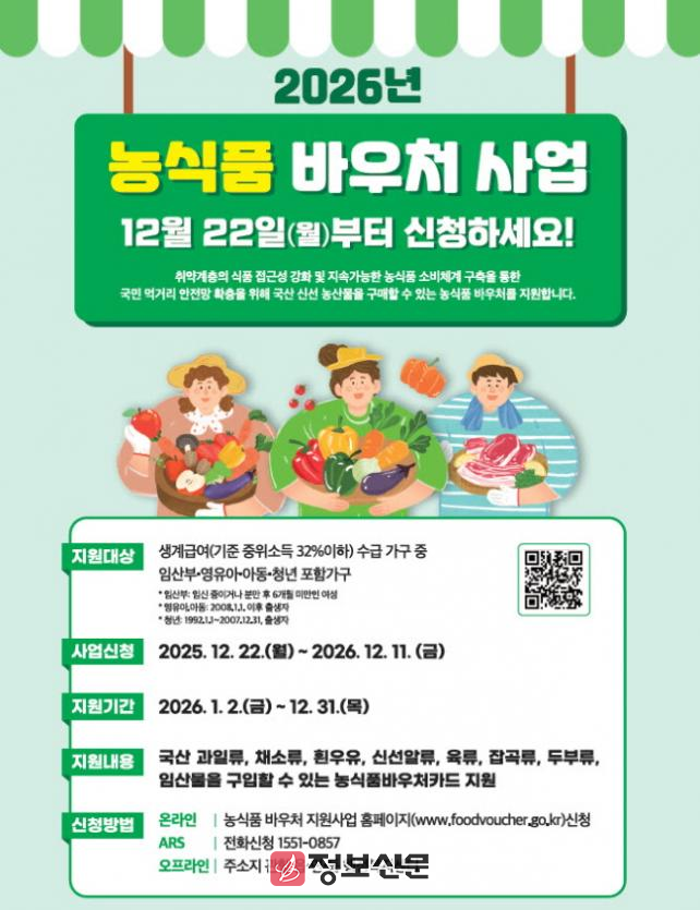 박은석 무주군농업기술센터 농촌활력과장은 "농식품 바우처는 취약 계층 군민들이 신선하고 균형 잡힌 농식품을 섭취할 수 있도록 뒷받침하는 정책“이라며 ”소급 지원이 되지 않는 만큼 대상 가구들이 꼭 신청해서 혜택을 누릴 수 있도록 홍보에도 최선을 다할 것“이라고 밝혔다.