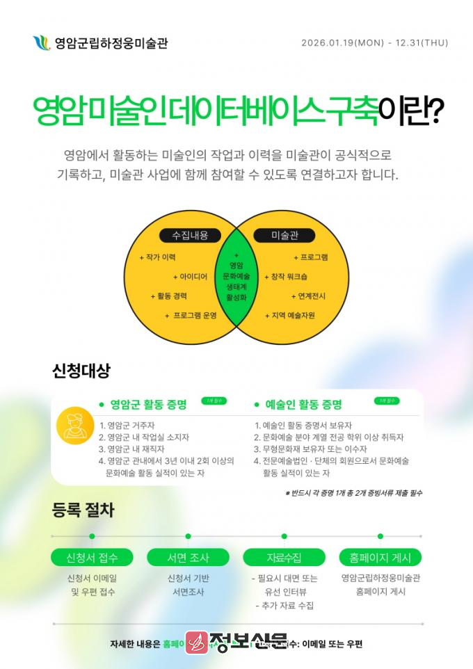 김규화 영암군립하정웅미술관 팀장은 “지역 미술인의 창작 활동을 기록해서 미술관과 지역 예술인이 지속적으로 교류·협력할 수 있는 기반을 마련하겠다. 데이터베이스를 기반으로 지역 미술인들의 활발한 참여를 이끌어 내 영암군민의 문화 감수성을 높이게 하겠다”고 밝혔다.