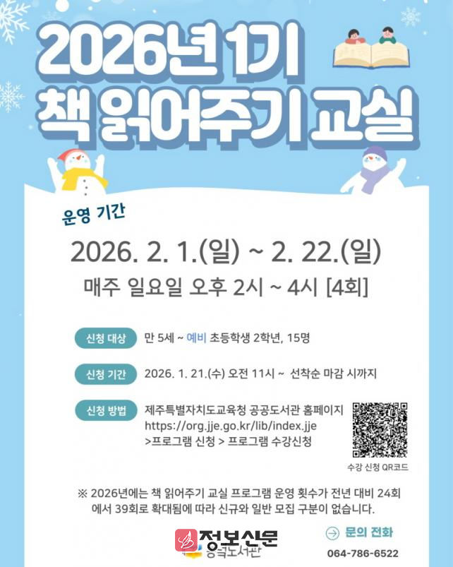모집 대상은 만 5세부터 예비 초등학교 2학년까지 어린이 15명으로 참가 신청은 오는 21일 오전 11시부터 제주특별자치도교육청 공공도서관 누리집(https://org.jje.go.kr/lib)을 통해 선착순으로 접수한다.