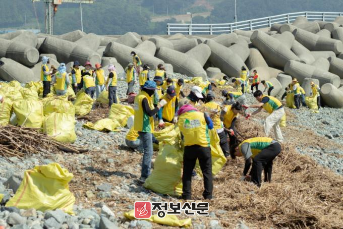 ![]() [사진 제공 = 신천지자원봉사단 광주전남연합회]지난해 8월 만성리 검은 모래 해변 일대에서 해양쓰레기를 수거하는 정화 봉사활동을 진행했다. |
