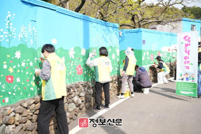 ![]() [사진 제공 = 신천지자원봉사단 광주전남연합회]지난해 4월 전남 광양시 세승마을에서 봉사자들이 담장에 벽화를 그리고 있다.