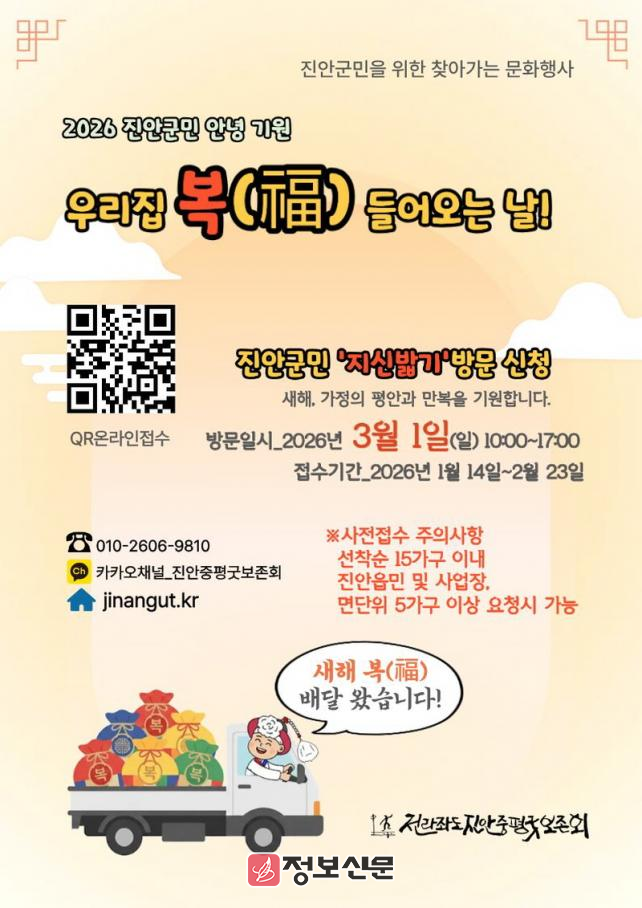 신청 대상은 진안군민 및 관내 사업장으로, 2월 23일(월) 오후 5시까지 선착순 15가구를 모집한다. 진안읍 지역을 우선으로 하며, 면 단위 지역은 5가구 이상 요청 시 방문이 가능하다.