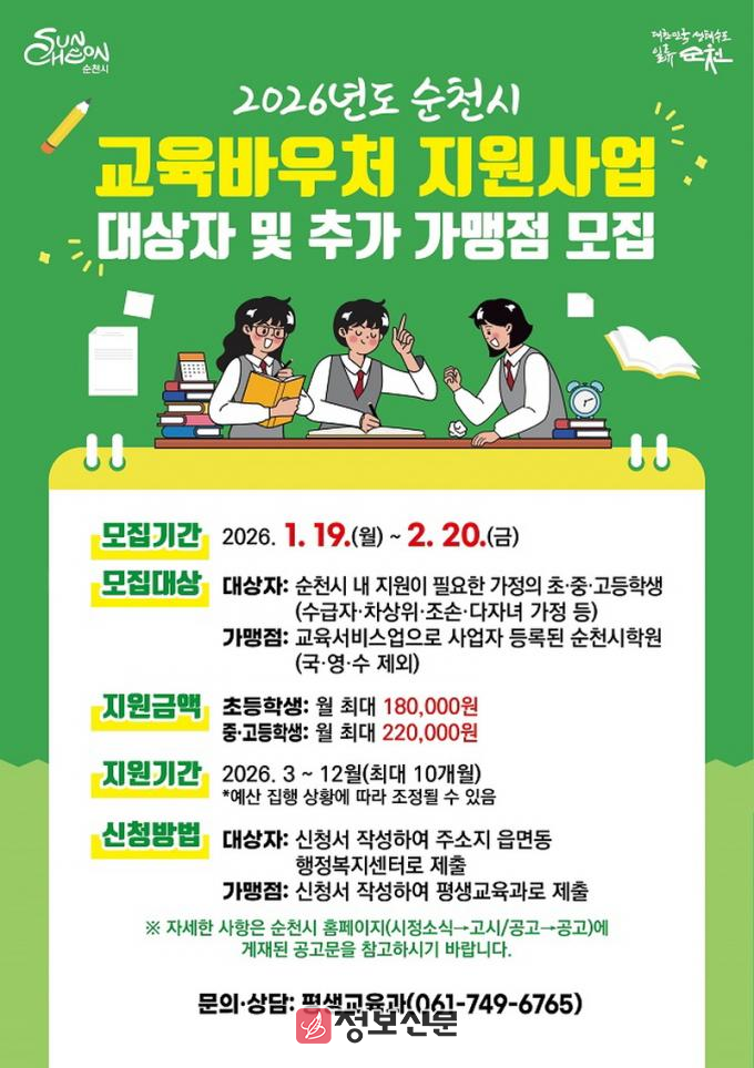 ![]() 순천시, 교육바우처 지원사업 추진 위한 대상자 및 가맹점 모집 |