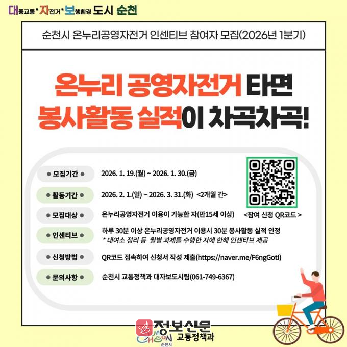 ![]() 순천시, 온누리 공영자전거 타며 봉사활동 실적도 쌓는다 |