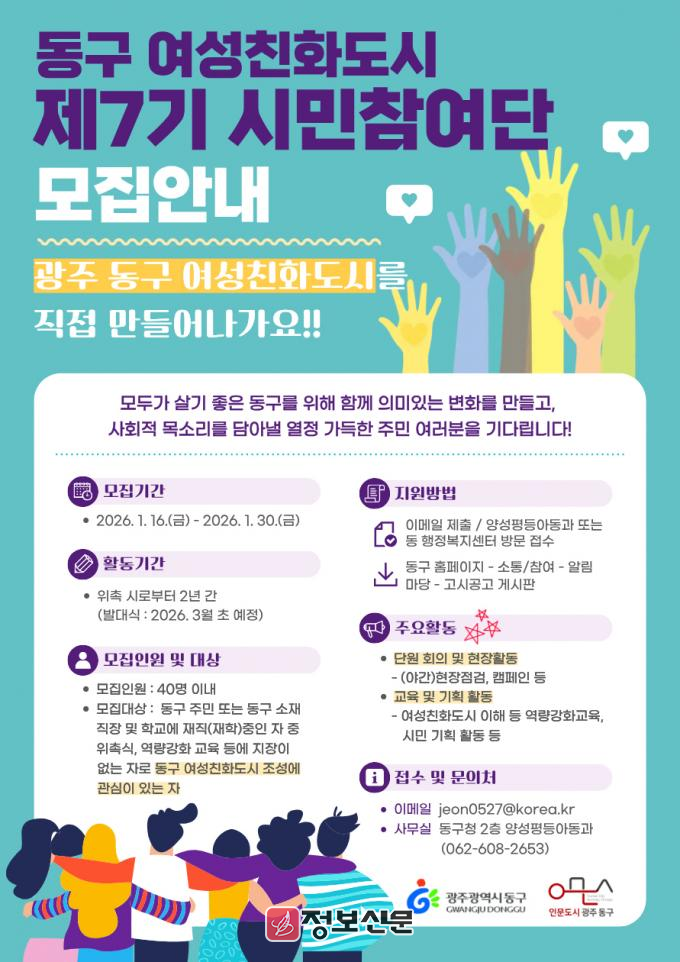 제7기 여성친화도시 시민참여단 신청은 동구청 양성평등아동과 또는 동 행정복지센터를 통해 이메일·방문 접수로 할 수 있으며, 기타 자세한 사항은 동구청 누리집 공고문에서 확인할 수 있다.