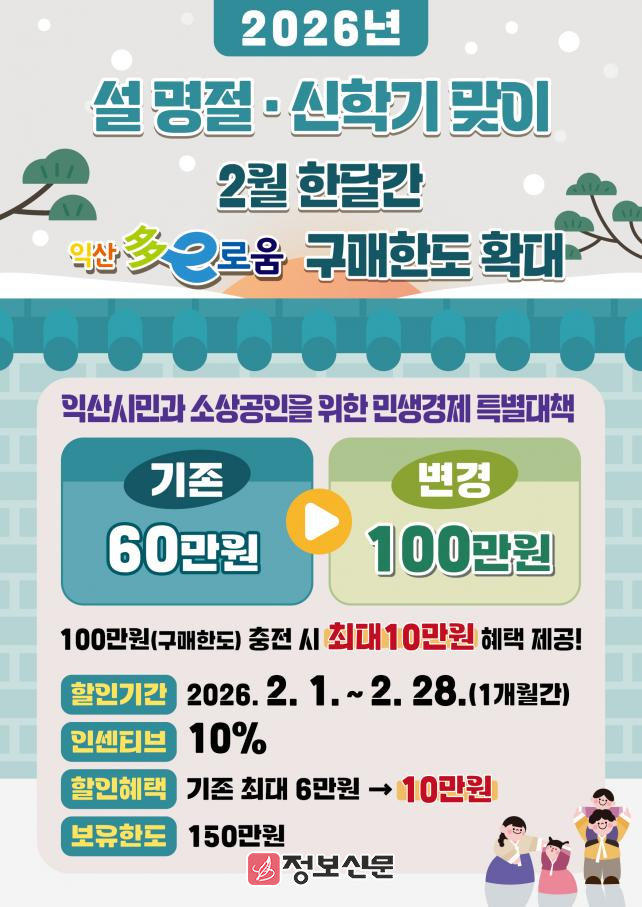 익산시는 2월 한 달 동안 다이로움 구매 한도를 기존 60만 원에서 100만 원으로 상향한다고 20일 밝혔다. 이번 혜택은 설 명절과 신학기 준비로 가중되는 장바구니 부담을 덜고, 지역 골목 경제에 활기를 불어넣기 위해 마련됐다.