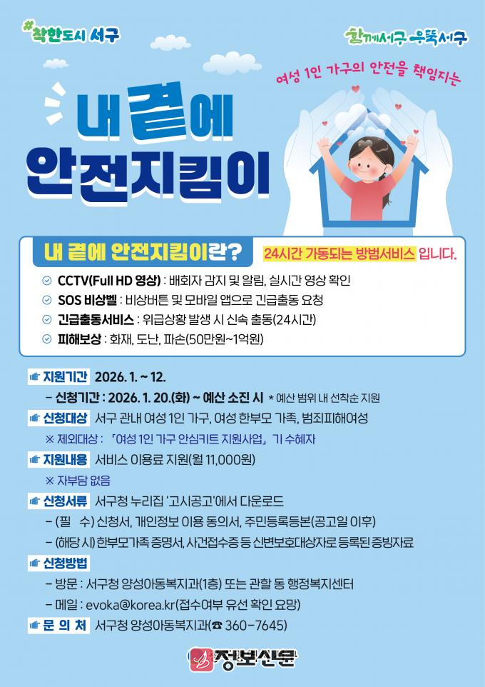 김민정 양성아동복지과장은 “안전지킴이 사업은 범죄에 대한 불안감을 낮추고 일상 속 심리적 안정감을 높여주는 실효성 있는 정책”이라며 “올해도 세밀하고 지속적인 주거안전 지원을 통해 안전 사각지대 없는 서구를 만들겠다”고 말했다.