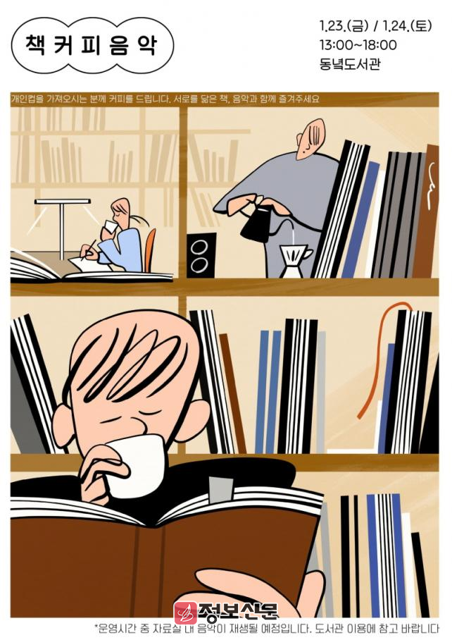 오는 23일과 24일에는 ‘겨울을 닮은 책과 음악’을 주제로 오는 오후 1시부터 6시까지 운영되며 기간에 개인용 컵을 지참하고 도서관 2층 종합자료실을 방문하는 이용자는 겨울 감성이 담긴 전시와 음악을 감상하며 사서가 내려주는 따뜻한 원두커피를 무료로 즐길 수 있다.