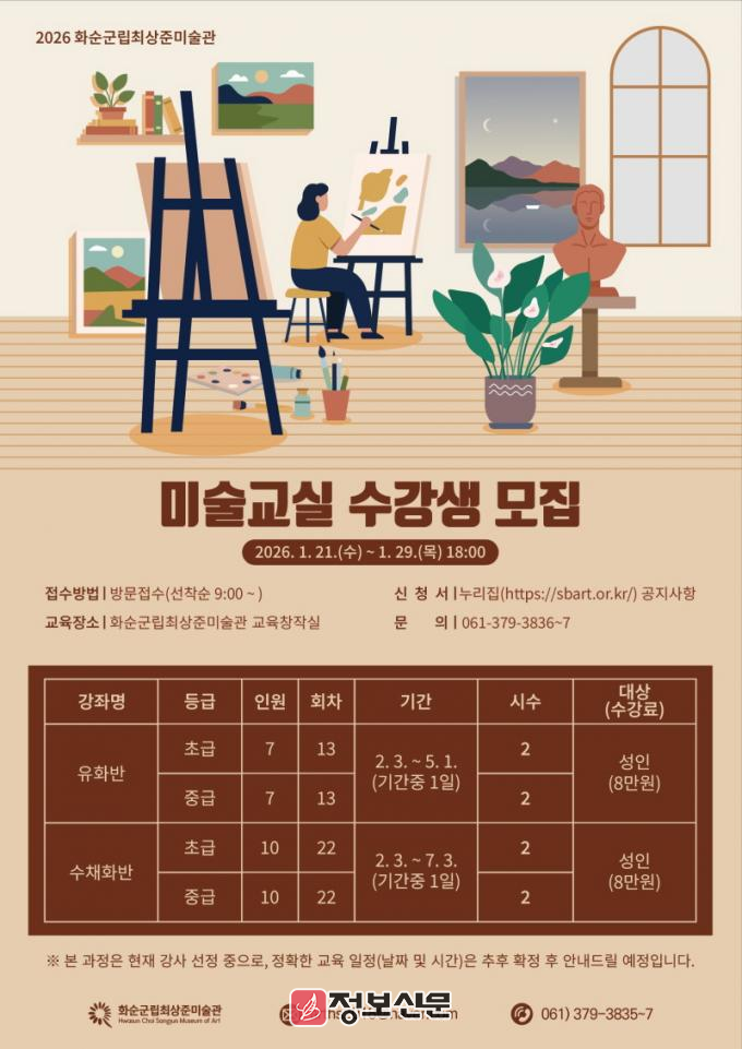 ![]() 화순군립최상준미술관, 미술교실 수강생 모집 |