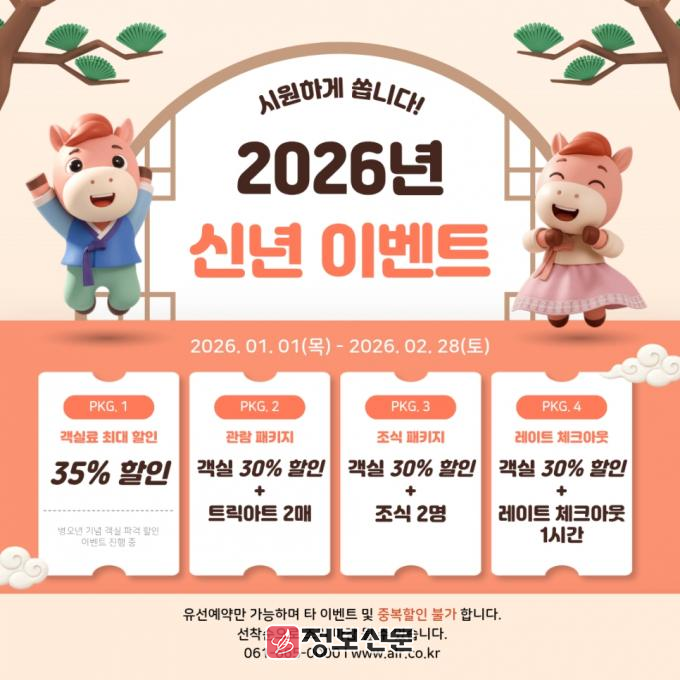 한편, 해당 신년 이벤트는 유선 예약으로만 가능하며, 기존 예약 건의 변경은 불가하다. 또한 타 이벤트 및 중복 할인은 적용되지 않는다.