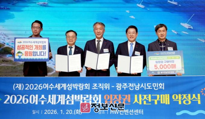 ![]() ▶ (재)2026여수세계섬박람회조직위원회는 지난 20일 서울 종로구 HW컨벤션센터에서 광주전남시도민회와 ‘2026여수세계섬박람회 입장권 5,000매 구매약정’을 체결했다. |