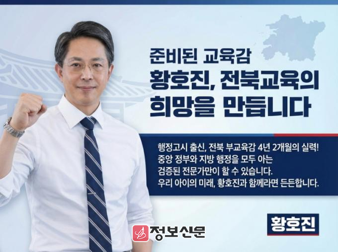 황 후보는 교육부, 대통령실, OECD 교육 외교관을 거쳐 전북 부교육감을 4년 2개월간 역임한 검증된 교육 행정 전문가다. 그는 “준비된 실력으로 무너진 전북 교육을 복원하고, 아이들이 경제적 어려움 없이 전북에서 꿈을 키울 수 있는 희망 교육을 반드시 만들겠다”고 강조했다.