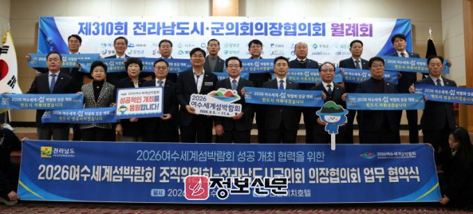 ![]() ▶ (재)2026여수세계섬박람회조직위원회는 1월 21일 목포 신안비치호텔에서 전라남도시군의장협의회와 ‘2026여수세계섬박람회 성공개최를 위한 업무협약’을 체결했다.
