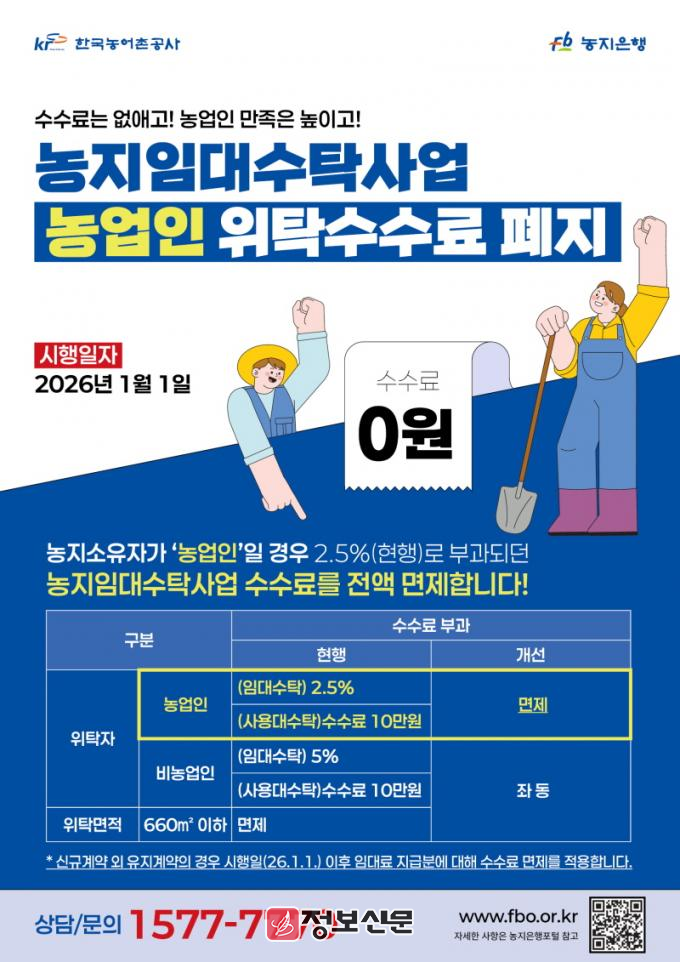 이번 개편으로 위탁자가‘농업인’인 경우, 농지임대위탁 수수료가 전액 면제된다. 또한 신규 계약뿐만 아니라 현재 계약을 유지 중인 농업인에게도 2026년 1월 1일 이후 부과되는 수수료에 대해서는 면제 혜택을 동일하게 적용한다.