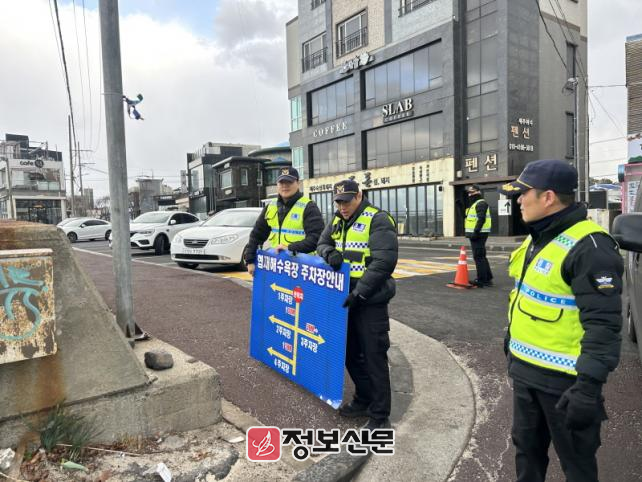 ![]() 제주경찰청 해안경비단, 강풍에 흔들리는 대형교통표지판을 그냥 지나치지 않는 경찰관들 |