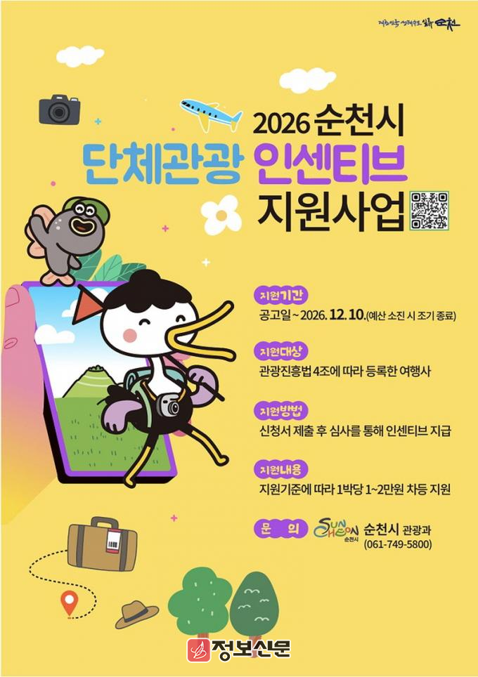 ![]() 순천시, 2026년 단체관광객 유치 인센티브 지원사업 추진 |