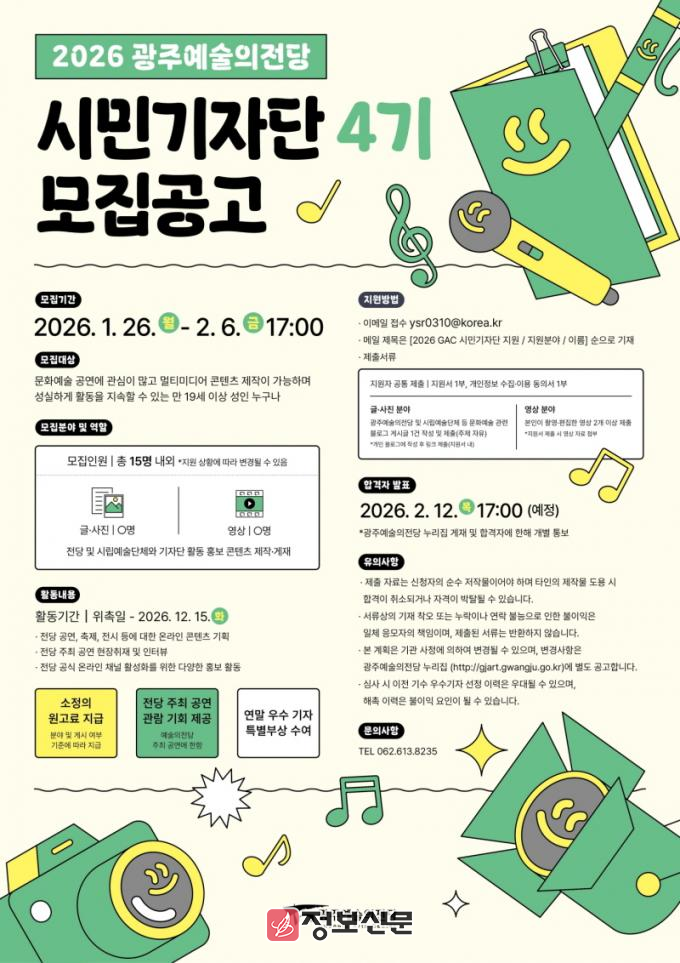 선발된 시민기자단은 오는 3월부터 12월 말까지 약 10개월간 활동하며, 광주예술의전당의 공연과 문화예술 현장을 취재해 기사와 콘텐츠를 제작하게 된다. 전당은 활동 기자단에게 소정의 원고료, 공연 관람 기회, 우수 기자 시상 등 다양한 혜택을 제공할 예정이다.